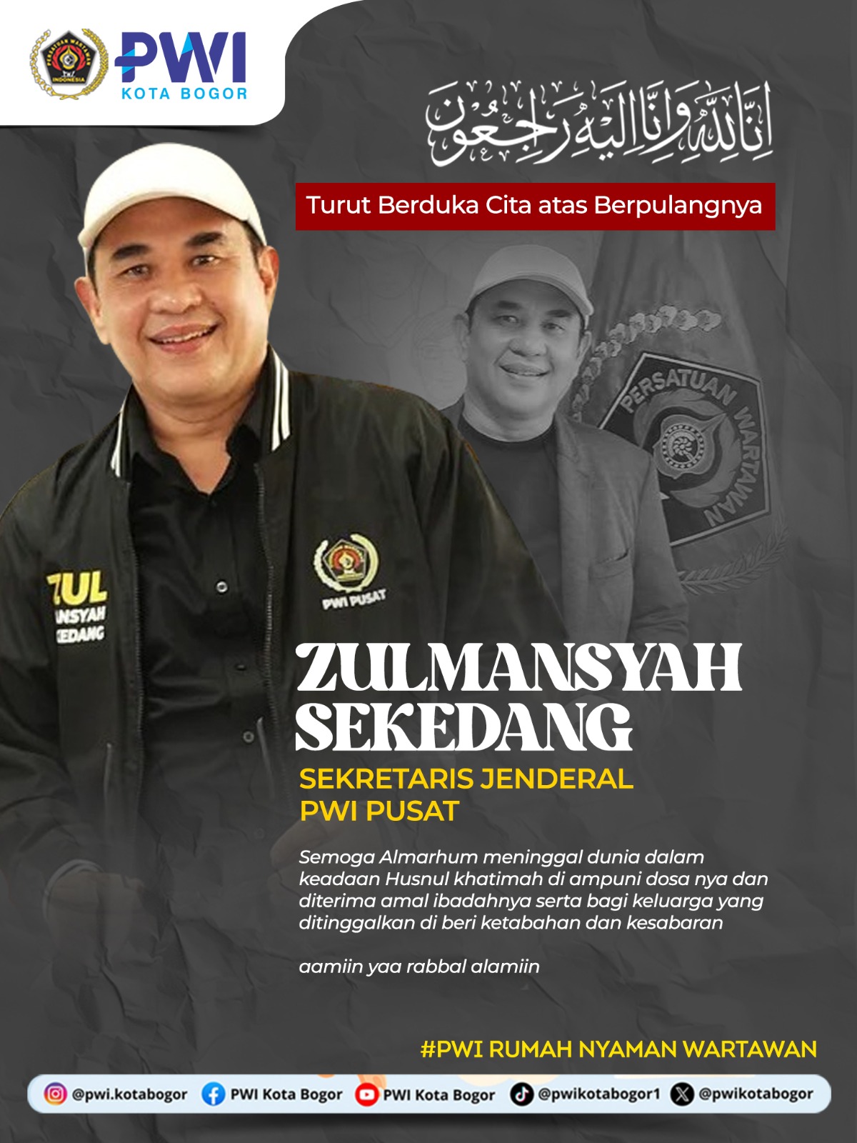 Kepergian Zulmansyah Sekedang merupakan kehilangan besar bagi PWI dan komunitas pers nasional. Almarhum dikenal sebagai pribadi yang ramah, riang, serta memiliki dedikasi tinggi terhadap dunia jurnalistik dan organisasi.