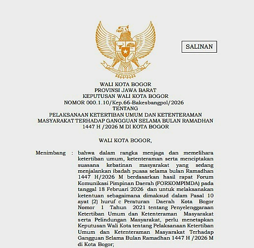 “Pelaksanaan ketertiban umum dan ketenteraman masyarakat terhadap gangguan selama Bulan Ramadhan 1447 H/2026 M di Kota Bogor,” demikian bunyi petikan keputusan tersebut.